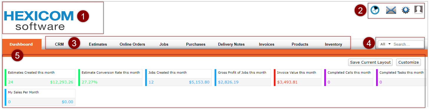 ❺ | Dashboard Summary | Customise the dashboard to provide a quick overview of the status of the system for your users, for example, display active jobs, or an overview of the financial status of the business. |