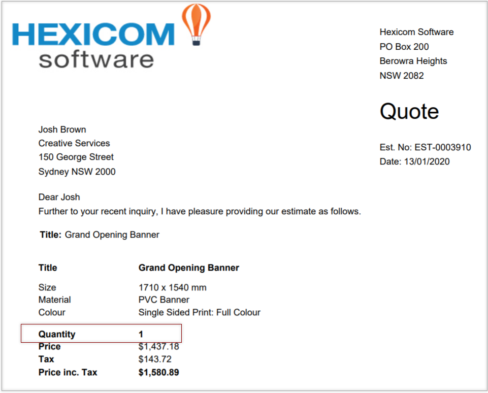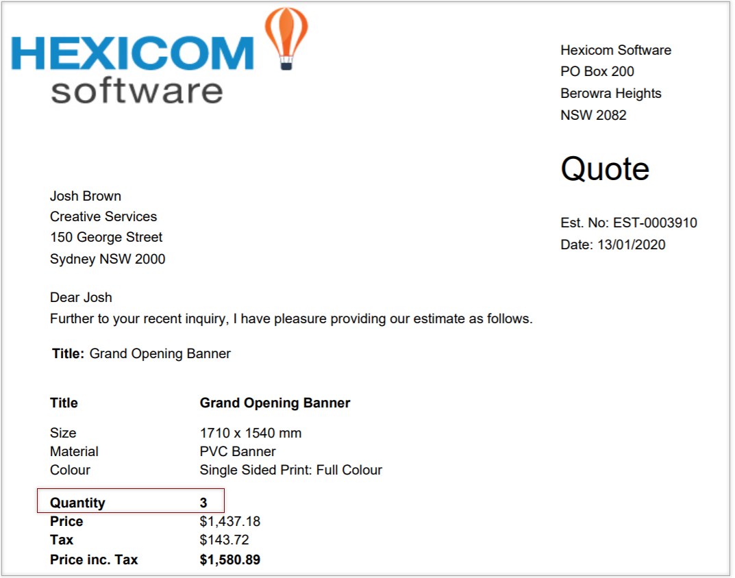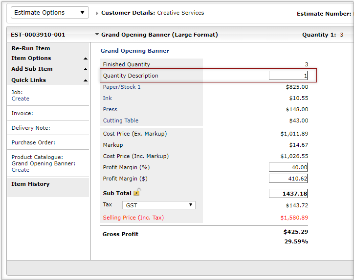 Note the Finished Quantity is 3, representing the 3 tiles, however when sending this estimate to the customer it would be preferable to show the order is for a single sign.