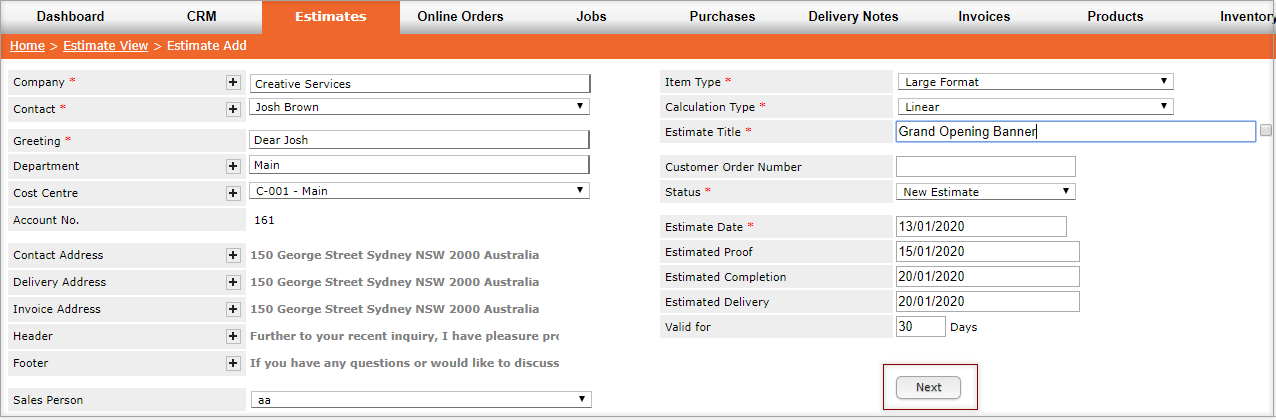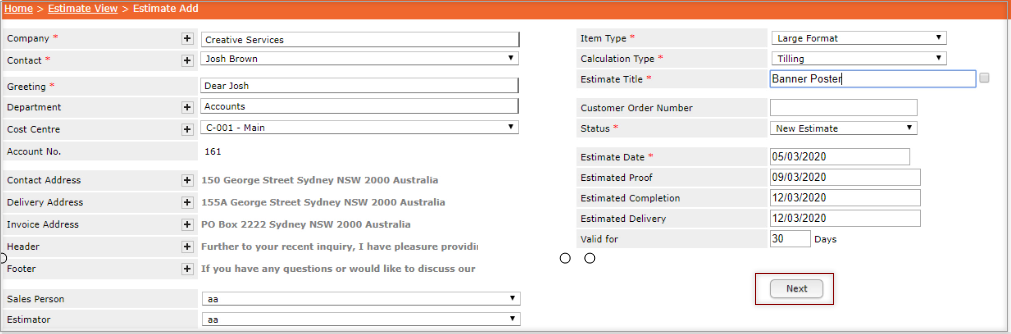 2. Complete the first page of the estimate, entering the customer details, selecting Large Format for the estimate type and completing the additional estimate details, then click Next.