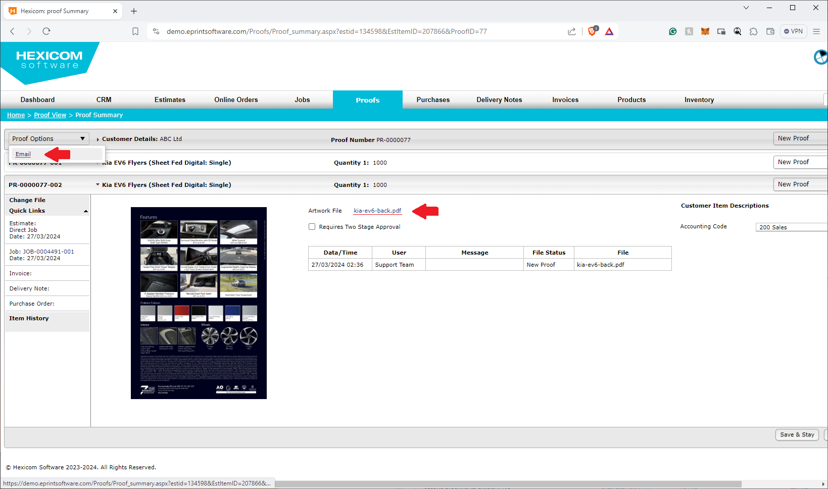 • To send the uploaded files to your customer for approval, hover over the “Proof Options” dropdown menu and select “Email.” This action will initiate the email process and notify the customer that proofs are available for review.