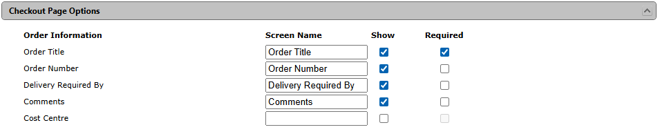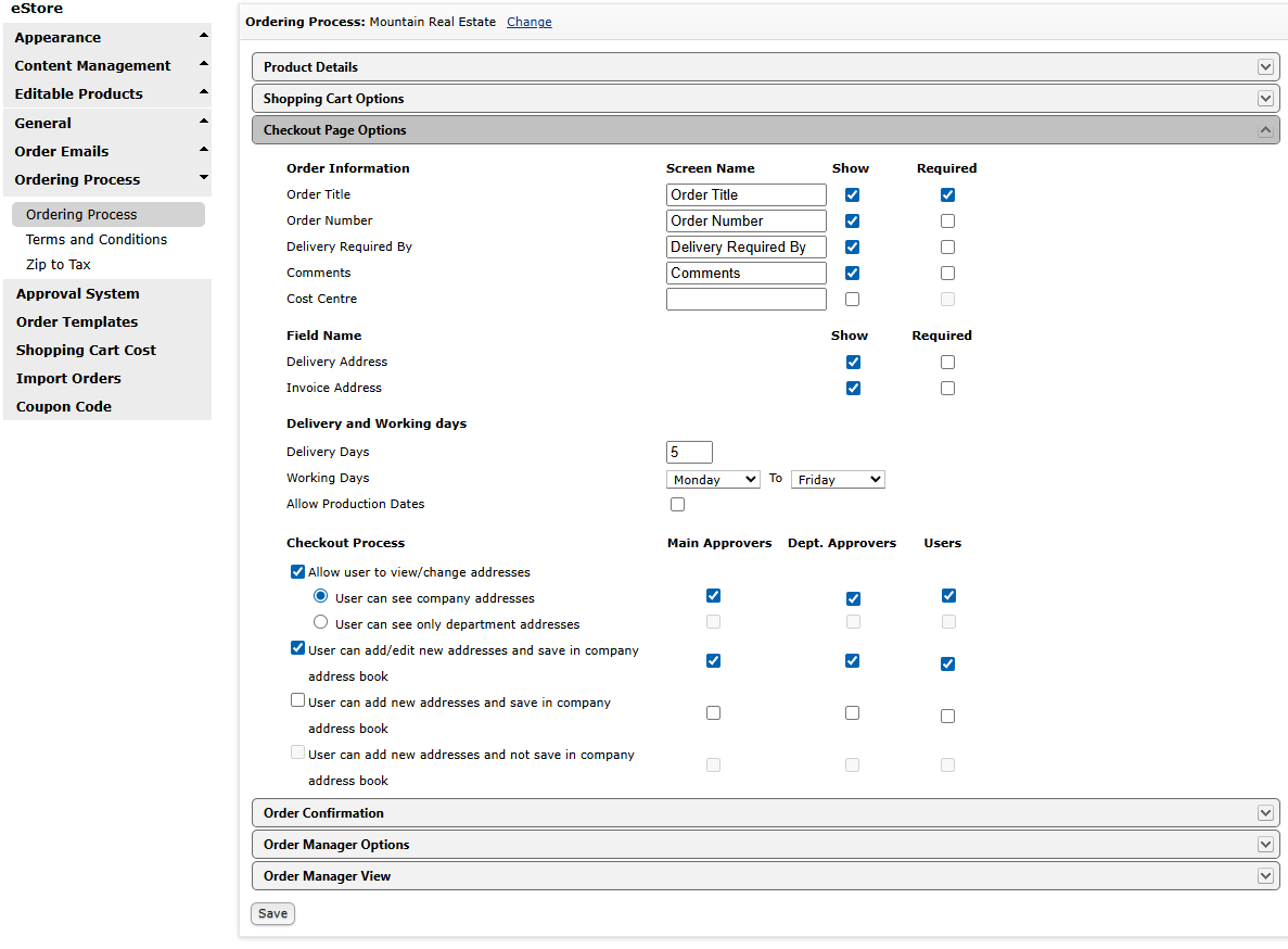 The Checkout Page Options section allows you to control what information customers see and enter during the checkout process in your eStore. These settings apply to both B2B and B2C stores and let you decide which fields are visible, which are required, and how addresses and delivery dates are handled.